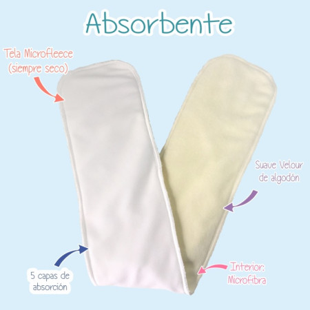 Incluye: Un absorbente con un lado de siempre seco , otro lado de velour de algodón e interior de microfibra para que elijas el lado que prefieras y un pañal de PUL unitalla sistema todo en 2